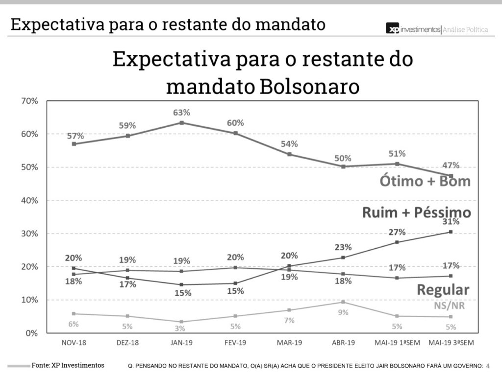 Responsável por encomendar a pesquisa XP/ Ipespe, a XP Investimentos acredita que esse acréscimo negativo representa o aglutinamento do grupo que antes considerava o governo regular. Da primeira a terceira semana de maio, a média de pessoas nesse meio-termo caiu de 31% para 26%. Por outro lado, outros 34% afirmam que o governo é ótimo ou bom e 4% não souberam avaliar ou não responderam.